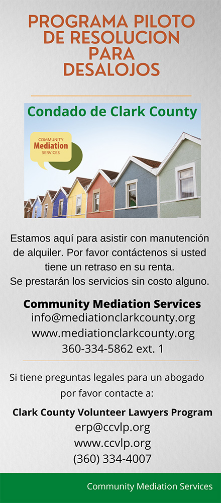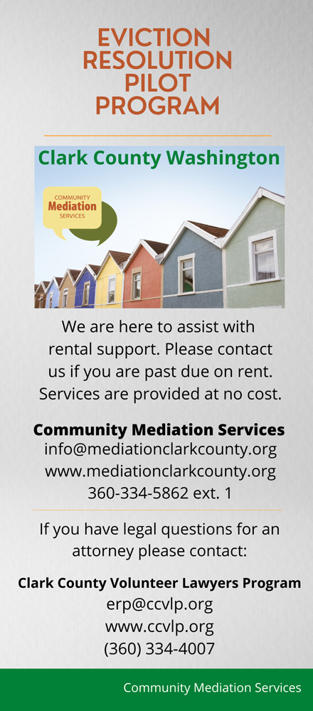 For information regarding the Eviction Resolution Pilot Program, please visit the Clark County website and the Washington State Court website. They have a helpful video on how the program works. Use the links below for important documents and information on those sites.